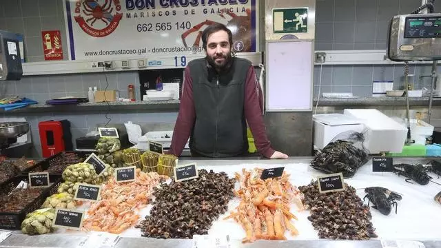 Cigalas a la venta en un puesto del mercado municipal de la plaza de Lugo. / Iago Lopez