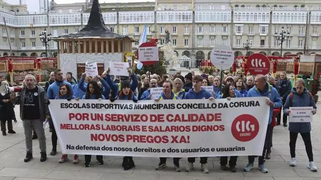 Los trabajadores de las Escolas Deportivas Municipais de A Coruña aprovecharon el pleno de este jueves para movilizarse y reivindicar que el Ayuntamiento cumpla su palabra de modificar sus condiciones laborales en el siguiente pliego. El personal denuncia precariedad laboral, demanda retribuciones acordes a la responsabilidad que se les exige y pide reducir la elevada parcialidad de los contratos. A estas circunstancias, se añade el impago de salarios, pues señalan que la empresa concesionaria, Serviplus, todavía no les ha abonado la nómina de noviembre.