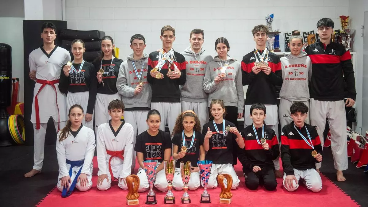 De ser 2 o 3 niños en clase a alcanzar medallas de oro en competiciones internacionales. Y de 40 licencias escasas a casi 120, la mayoría de base y con una destacada presencia femenina, entre las que se encuentran algunos de los taekwondistas con mayor proyección de Galicia o España. Así ha sido el crecimiento meteórico del JFR Taekwondo en apenas un lustro de vida, un club joven y ambicioso que pretende consolidarse como una de las referencias de su deporte en A Coruña. «La idea siempre fue trabajar día a día. Teníamos objetivos fijados de alto nivel cuando empezamos, porque somos competidores natos, y sabíamos la línea que queríamos seguir. No nos marcábamos fechas [para cosechar éxitos], pero encontramos un grupo de deportistas y familias que nos permitieron ir más rápido de los que esperábamos», resume Juan Fernández, director y entrenador de la entidad.