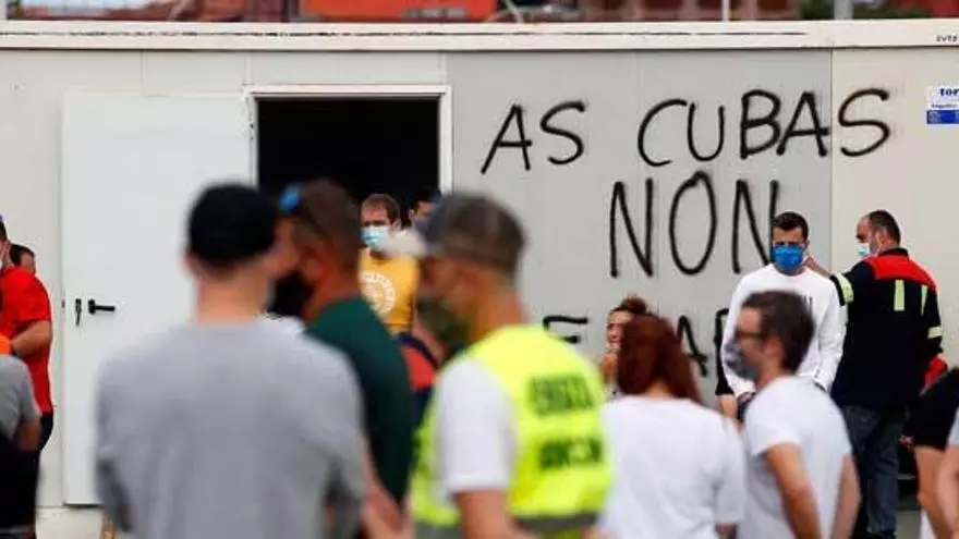 Trabajadores en la entrada de San Cibrao, ayer, donde puede leerse 'As cubas non se paran'. / // Eliseo Trigo