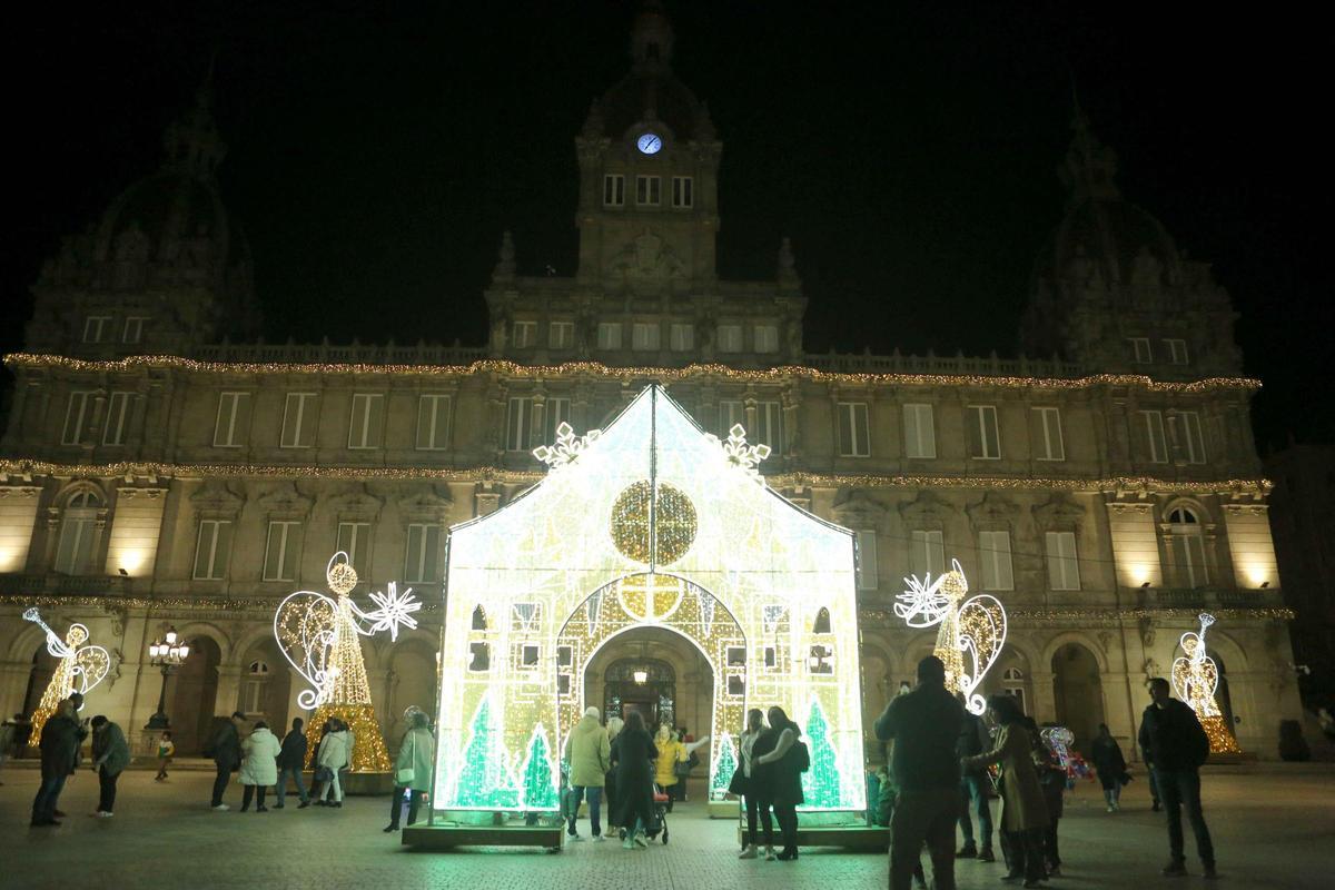 Una casa navideña y ángeles en María Pita