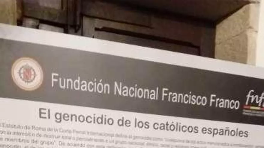 A las constantes menciones al "Generalísimo" y "el Caudillo" se suma la instalación de un panel en recuerdo del "genocidio de los católicos españoles" en la capilla diseñada por Emilia Pardo Bazán. En este cartel, la Fundación Franco carga contra "los episodios de gran crueldad y de verdadero sadismo del Frente Popular" y ensalza la importancia del Valle de los Caídos, "el monumento funerario más importante levantado por la humanidad en el siglo XX". "Hoy los continuadores del Frente Popular proponen exhumar de la basílica los cuerpos de Francisco Franco y José Antonio Primo de Rivera, lo que nos retrotrae a 1936 y a actos execrables", recoge el panel instalado en el BIC.