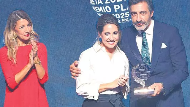 Juan del Val y Ángela Banzas, ganador y finalista del Planeta, junto a Yolanda Díaz. | Manu Mitru